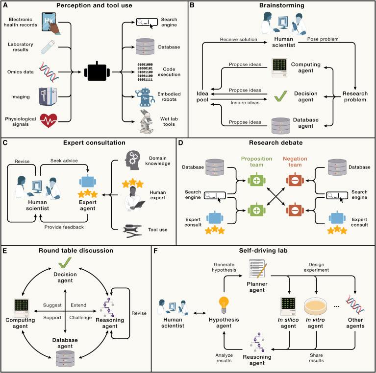 We envision collaborative AI agents that integrate LLMs, generative models, and biomedical tools to empower scientific research — from virtual cell simulation and phenotype control to the design of new therapies. Rather than replacing humans, these agents combine human creativity with AI's ability to navigate vast hypothesis spaces, plan discovery workflows, and perform self-assessment to identify knowledge gaps.