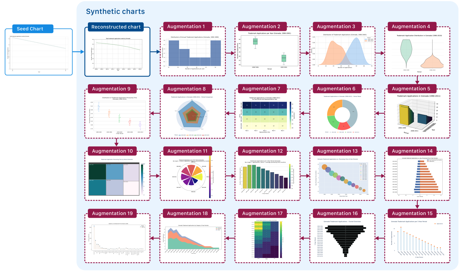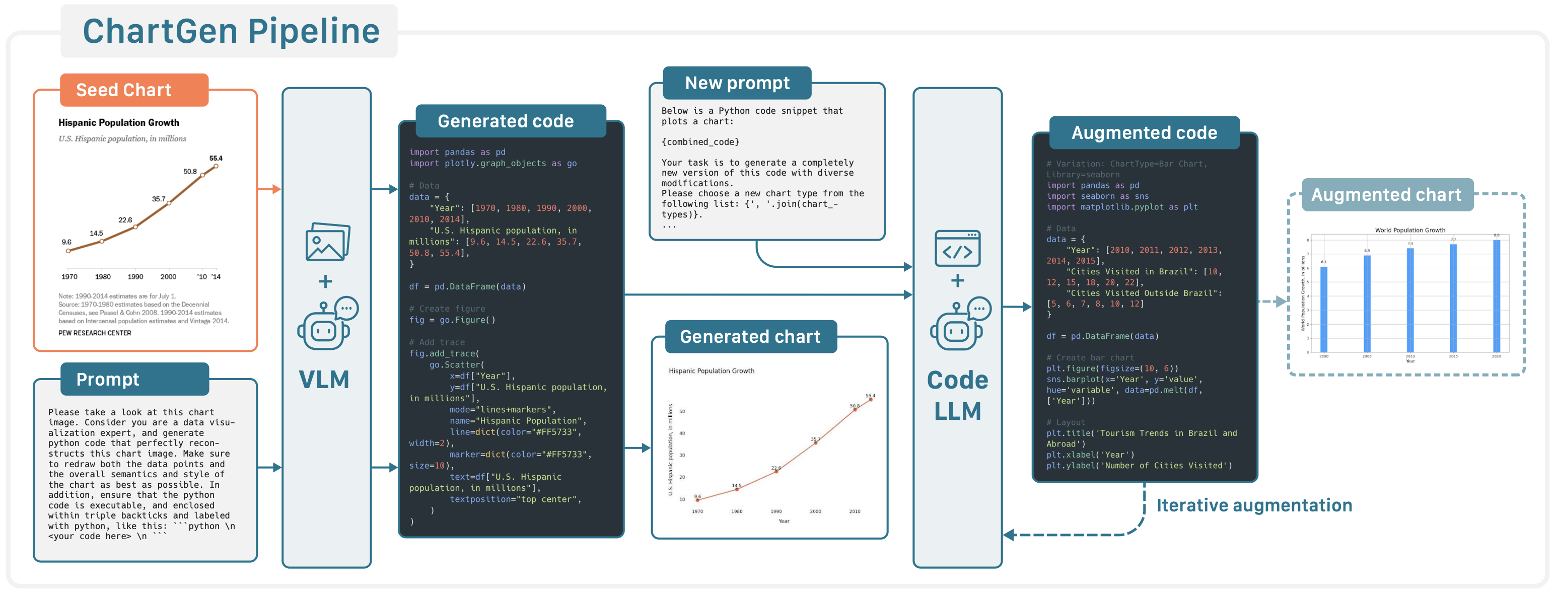 We present a fully automated synthesis pipeline that uses a VLM to reconstruct seed chart images into executable plotting code, then iteratively augments scripts with a code-oriented LLM to generate diverse synthetic chart-image-code pairs at scale. From just 13K seed images, ChartGen produces 222.5K unique chart image-code pairs across 24 chart types and 11 plotting libraries. We release the pipeline, prompts, and dataset to advance chart understanding research.