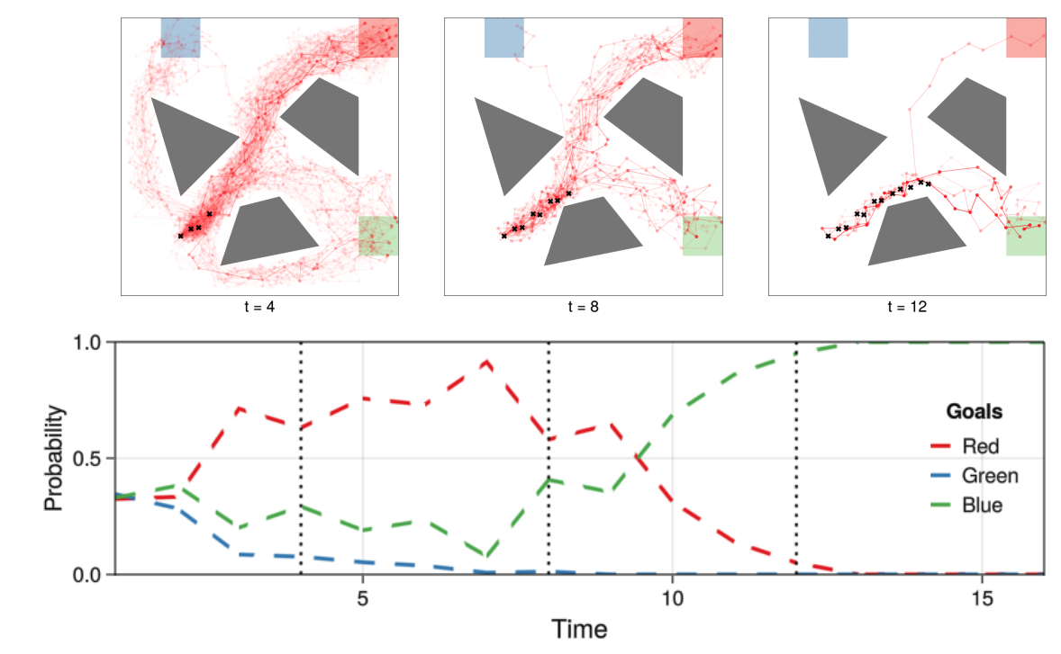 We perform online goal inference and trajectory prediction in continuous domains by modeling agents as approximately Boltzmann-rational motion planners that produce low-cost trajectories while avoiding obstacles. Using a sequential Monte Carlo algorithm, we approximate the full posterior distribution over goals and future trajectories from partial, noisy observations in real time.